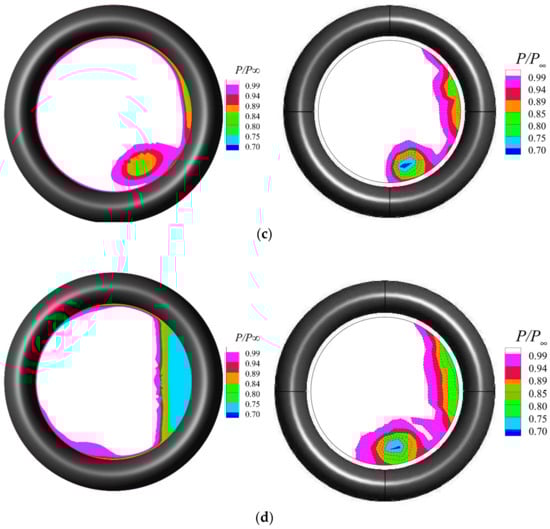 Comparisons of the total pressure between the CFD (left) and experimental data (experimental plot courtesy of Cranfield University library) (right) at the AIP [10], SST turbulence model. (a) ; (b) ; (c) ; and (d) .
