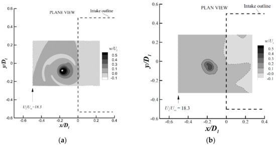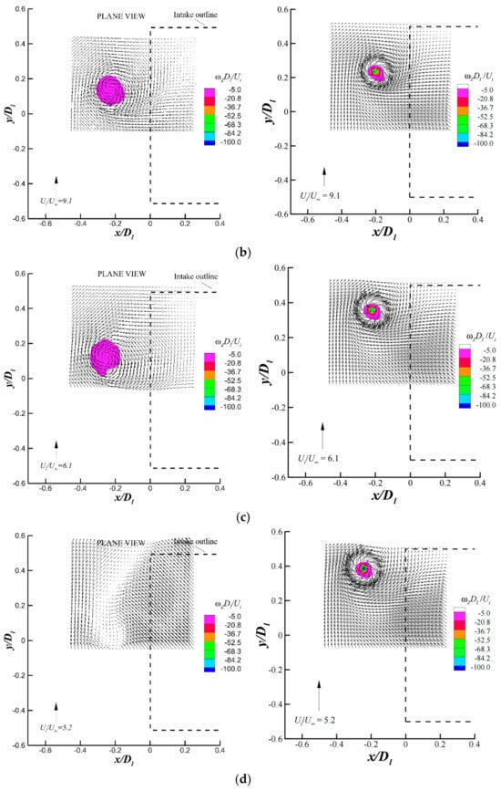 where is the area of the circle. Since the vorticity is negative within the vortex core, only the negative value of is integrated. The total average non-dimensional vortex strength is obtained by dividing with the intake velocity and the diameter of the intake . Further details about the computational procedure can be found in [10].