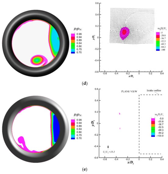 For the velocity ratio from 18.3 to 6.1, the computed pattern of the total pressure is very similar to those in the experiments. The pre-cited circumferential and radial position of the vortex also agree well with the measured data. However, the CFD results substantially underpredict the total pressure loss caused by the ground vortex at the AIP for all four conditions. The flow separation near the intake lip is also less for . The ground vortex in the CFD is even blown away when the velocity ratio increases to . However, the total pressure loss near the windward lip is overpredicted. For this case, a possible reason is that the CFD fails to present the strong velocity gradient for the ground vortex. With the absent of the ground vortex, to reach the same mass flow, the separation region near the windward lip becomes larger to account for the mass flow loss caused by the vortex. Another interesting observation is that the shape of the vortex core is more oval than that in the experiments.
