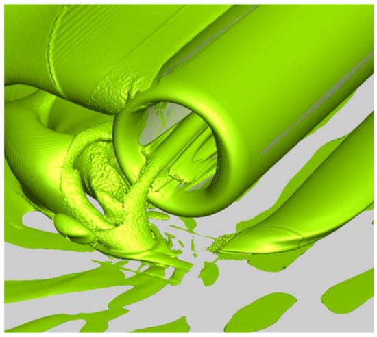 In this section, the structure of the ground vortex system with crosswind is further investigated. Figure 19a shows a zoomed view of the fully established vortex for the condition of with DDES simulation. The instantaneous streamlines into the intake are shown. The black streamlines denote the trace of the upper trailing vortex, which is formed when the shedding flow from the upper shell of the intake is ingested back into the tube. The blue ones represent the flow within the vortex core. The purple streamlines demonstrate the helical structure of the flow around the vortex core. The simulation captures the helical path of the streamlines around the vortex core observed in the experiments [29], as marked with the black arrow in Figure 19b. The red one denotes the lower trailing vortex, which starts from the lower shell of the intake. The yellow ones denote the flow sucked into the intake with no vorticity.