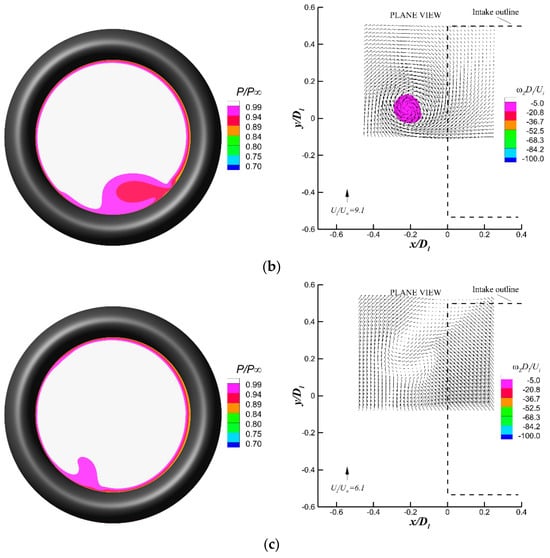 Time-averaged total pressure at the AIP and velocity vector field of the PIV measurement plane for different crosswind speeds, DDES computation. (a) ; (b) ; and (c) .