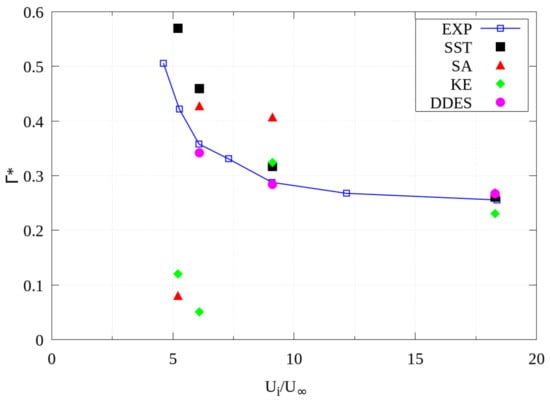 To facilitate the prediction of the behaviour of the ground vortex, the computational fluid dynamic (CFD) simulations have been increasingly adopted [3,15,17,18,19,20,21]. These studies contributed to the analysis of the flow field structure with the ground vortex and provided valuable details as the three-dimensional visualisation of the ground vortex is demanding and costly. However, in most instances, the numerical simulations can only deliver qualitative estimations while the accurate prediction of the behaviour of the ground vortex is still very challenging [22,23]. For the simulations with low-speed crosswinds and low-speed inflow velocity, the match between the CFD and the experimental data is generally good. The simulations of the ground vortex with the crosswind speed of 10 m/s and the intake speed of 85 m/s can display a good agreement with the measured data in terms of the vortex equivalent radius and vortex tangential velocity [20,24]. The large eddy simulation (LES) at low Re number () performed in [19] can capture the observations in the experimental data [6] qualitatively. In another work [25], LES is used to study the dynamics of the ground vortex, and a comparison of the mean velocity field shows good agreement between the experimental and the CFD results. The mean velocity through the intake is 26 m/s, which results in a Reynolds number of about 65,000. The numerical study presented in [16] investigated the vortex behaviours with the intake suction speed up to 32 m/s and the crosswind velocity up to 14 m/s, and the intake Reynolds number ranged from 1.74 × 105 to 2.18 × 105.