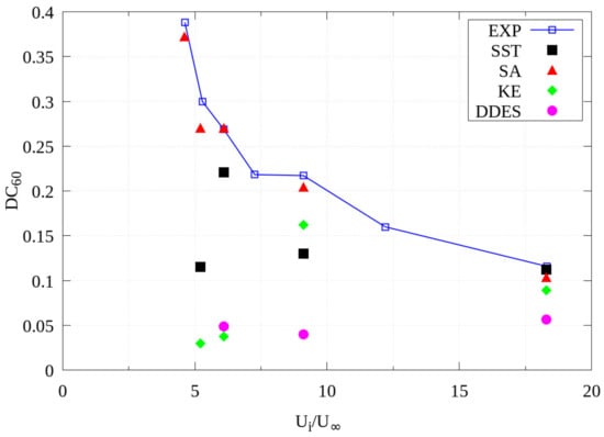 The influence of the inflow turbulence strength is tested with the SST model for the condition of . The normalised thickness of the boundary layer is 0.03 for all computations. The DC60 and for various turbulence strength are listed in Table 2. The results imply that remains unchanged with different turbulence strengths. However, the DC60 decreases with the increase in the turbulence strength.