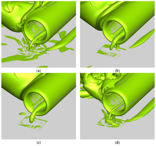 Vortex configuration presented by different turbulence models: (a) SST; (b) SA; (c) ; and (d) DDES.