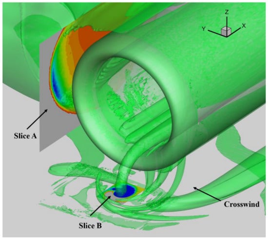 The surface streamline at the PIV measurement surface with the vortices is demonstrated in Figure 19c. The ground vortex is accompanied with the near-ground shear vortices, which are caused by the interactions between the suction flow into the intake and the main stream (i.e., the crosswind). The surface streamline on Slice A (Y = 0.025) in Figure 19b shows the reverse flow within the near-ground shear vortex. Another slice, Slice B cuts through the vortex core along the X direction, which will be discussed later. The lower tailing vortex has shifted its position and no longer hangs on the leeward side of the intake. In the flow field with a mature ground vortex, another near-ground shear vortex exists underneath the intake, which marks the boundary between the clockwise-rotating stream driven by the suction of the ground vortex and the main stream.