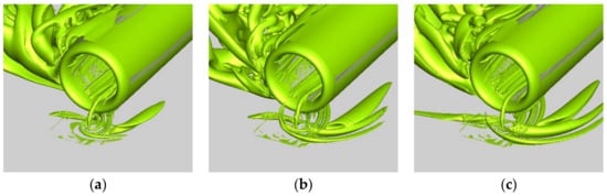 where and are the anti-symmetric and symmetric components of the velocity gradient tensor. In this work, the iso-surface of Q = 20,000 is used to identify the outline of the ground vortex unless otherwise stated. Figure 3 shows the contour of the ground vortex with the k—ω SST turbulence model for the velocity ratio . The trailing vortex at the leeward side of the intake and a ground vortex can be distinguished. The rotational direction of the vortex is clockwise when looking from top. The diameter of the ground vortex becomes larger when it is ingested from the ground surface into the intake.