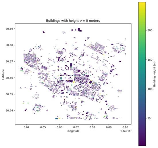 Figure 1 depicts a two-dimensional representation of the urban ULAA, wherein the height of the buildings is represented by colour. Buildings of greater height are represented by yellow, while those of lesser height are represented by purple.