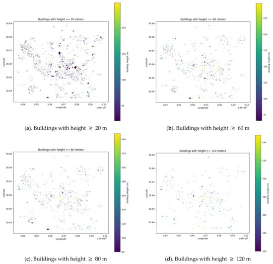 Table 2 illustrates the variation in the number of buildings with height in the urban area under investigation, as well as the planar area of the airspace occupied by the 2D projections of the buildings.