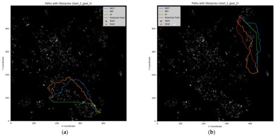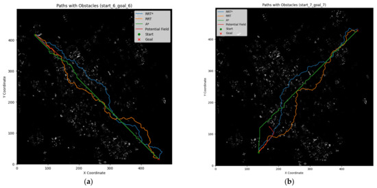 Figure 3a to circumvent obstacles. The paths generated by the artificial potential field algorithm are consistently successful in reaching the landing point, whereas the paths generated by the A* algorithm are locally optimal in this instance, resulting in excessively lengthy generated paths. The length of the generated path is excessive.