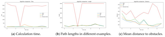 Figure 3. However, the distance between these points differed from that observed in the aforementioned experiment, which exhibited a longer distance. It can be observed that as the distance between the takeoff and landing points increases, the RRT, RRT*, and A* algorithms are still capable of generating a path between the takeoff and landing points. However, the artificial potential field method, which was previously planned to the region with dense buildings, is consistent with the experimental results in