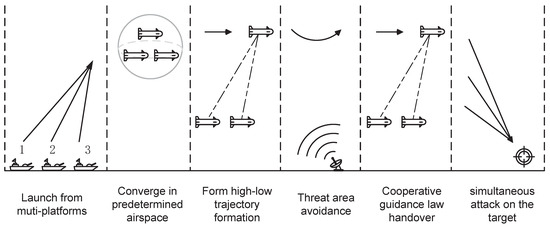 The operational scenario studied in this paper involves using multiple missiles to attack a high-value military target with tight air defense systems, and the operational process is shown in Figure 1. Multiple missiles launched from various platforms converge in the predetermined airspace, forming a stable communication link between them and approaching the target in a high–low-trajectory formation to penetrate the target’s long-range and mid-range air defense network. After the missile-borne sensors detect the target’s location, the cooperative guidance law is employed to achieve the simultaneous attacks of multiple missiles against the target. It places tremendous pressure on the target’s short-range air defense system in a short period, making it overloaded and unable to intercept all of the missiles. The focus of this paper is on solving the cooperative guidance problem in the abovementioned missile swarm operation process.