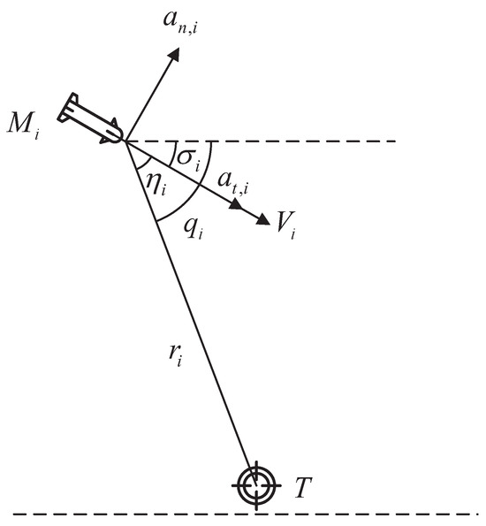 In Figure 2, T represents the target to be attacked, represents the i-th missile in the swarm; , , and , respectively, represent the angle between the LOS (line of sight) and the horizontal reference line, heading error, and fight-path angle of the i-th missile; represents the distance between the i-th missile and the target; and , respectively, represent the normal acceleration and tangential acceleration of the i-th missile.
