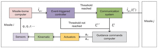 In addition, to the best of the authors’ knowledge, current research on the guidance law for cooperative simultaneous attacks relies on the assumption of “continuous communication” [16,17,18,19]. This assumption requires that the missile swarm be supported by powerful computing resources and the ideal communication environment. In the actual battlefield environment, missiles generally rely on their internal power supply, and the computing capabilities of processors and the communication bandwidth are limited. Frequent communication introduces latency and packet loss and consumes a large number of computing resources, which will lead to the instability of the control system and shorten the available time for executing missions. The main focus of this paper is on how to reduce the frequency of communication among missiles while ensuring the completion of simultaneous attacks. Introducing the event-triggered mechanism can provide a solution to the above problems, and its core idea is to decide whether a missile communicates based on whether the defined event is satisfied. The event-triggered mechanism has already been studied in the multi-agent field [20,21,22,23,24]. Ref. [20] studied the fixed-time consensus of a first-order multi-agent system based on the event-triggered mechanism under an undirected communication topology and provided two event-triggered strategies: centralized and distributed. The conclusion is that distributed event-triggered strategy should be given priority in the case of a large number of swarm members. Ref. [21] solved the global stability problem of a general linear system by limited control of the event-triggered mechanism. Since actual systems are nonlinear, it is necessary to study the event-triggered mechanism of nonlinear multi-agent systems, and Refs. [22,23], respectively, studied the event-triggered strategies of nonlinear systems with dynamic disturbances. Ref. [24] studied the adaptive event-triggered mechanism of multi-agent systems with randomly switching communication topologies.