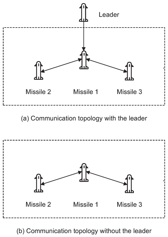 Assume that during the cooperative guidance, the missile swarm consists of one leader and N followers. The leader is responsible for constructing the battlefield situation at a high altitude and transmitting relevant information to the low-altitude flying followers in real time. To maintain stealth, the follower missiles generally do not send information to the leader, so the movement status of the leader missile is independent and is not affected by the follower missiles. In this case, the movement status of all followers must be synchronized with the leader to achieve simultaneous attacks.