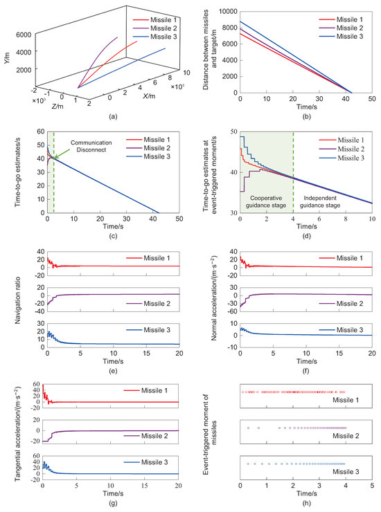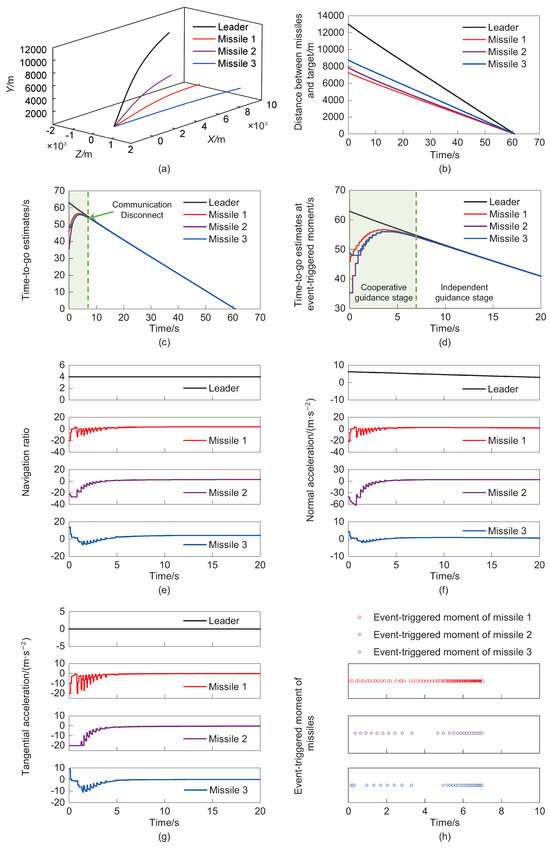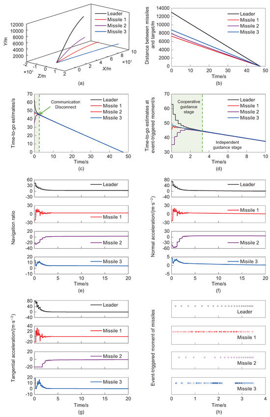 Figure 6d,e, respectively, show the variable curves of the time-to-go estimates at the event-triggered moment and the navigation ratio with time, both of which converged to consensus at 4 s. From Figure 6f,g, it can be seen that the range of the controlled input for the normal and tangential accelerations is and , respectively. The required maximum control input is slightly larger than that in scenario 1, which is because the parameters of the guidance law are not adjusted for a more intuitive comparison with the simulation results of scenario 1. Figure 6h shows the event-triggered moment information of the missiles. Because follower missile 1 is still a node of the missile swarm in this scenario, its communication is the most frequent. However, compared to scenario 1, the number of communications is significantly reduced due to the absence of the leader missile.