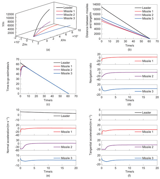 Figure 5e shows the variable curves of the navigation rate of the missiles with time. The leader’s navigation rate remained at 4, and the follower’s navigation rate converged to a constant 4 at 7 s. This means that from this moment on, the time-to-go estimates of the missile represent the real time-to-go.