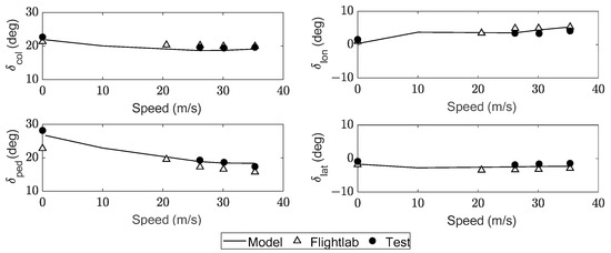 Figure 4 shows the trimmed helicopter controls of the HSLS. It can be observed that the model-calculated results are close to those of the flight test and Flightlab simulation [23], indicating the credibility of the HSLS model.