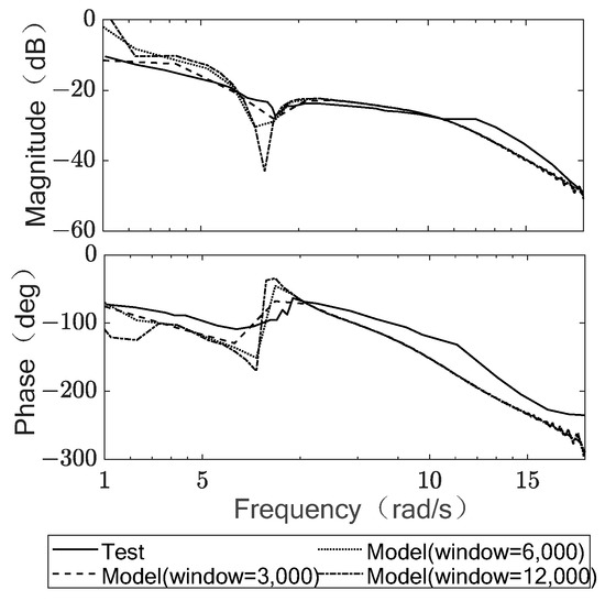 Since this paper is focused on assessing HQ, response characteristics should be validated in addition to trimmed characteristics. Response characteristics validation follows a similar procedure of system identification as the flight test. A frequency sweep of 0.4–20 rad/s is used to generate the time response of HSLS. A system identification tool based on Welch’s averaged periodogram method [24] is then used to estimate the frequency response. Given that window width is a critical parameter for system identification, Figure 5 is provided to demonstrate the consistency of window width selection between model simulations and flight test identifications. The sampling rate is 200 Hz. It can be observed that as the window width increases, the magnitude notch and phase lag phenomena become more pronounced, occurring at a load swing frequency of about 1.5 rad/s. This is because a longer window width improves frequency resolution. However, a longer window width also worsens noise reduction performance. Therefore, in practical applications, choosing an appropriate window width is crucial. As shown in Figure 5, a window width of 3000 aligns with the settings used in the flight test identification.