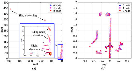 To determine the appropriate number of sling nodes, the impact of sling node number on HSLS dynamics was examined. Figure 8 shows all eigenvalues of the HSLS with each sling being divided by 0, 1, or 2 sling nodes. Figure 8a reveals that the number of sling nodes primarily influences high-frequency dynamics, introducing additional modes related to sling stretching and sling node vibration. However, these affected frequencies exceed 50 rad/s, whereas the frequency range pertinent to flight dynamics is below 10 rad/s. As shown in Figure 8b, a closer examination of the low-frequency range indicates that the number of sling nodes has minimal impact on flight dynamics. This is because the slings are lightweight with high stiffness, resulting in sling dynamics occurring at frequencies significantly higher than those of the flight dynamic modes. Consequently, for all sling configurations in subsequent analyses, the number of sling nodes is set to zero.