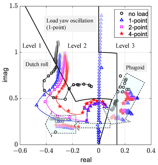 Figure 9 displays the low-frequency oscillatory mode eigenvalues for four cases and various speeds. For comparison, the case without a slung load is also included alongside three sling configurations. As speed increases, the stability of the helicopter’s Dutch roll mode and phugoid mode improves, although their responses to speed changes are different.
