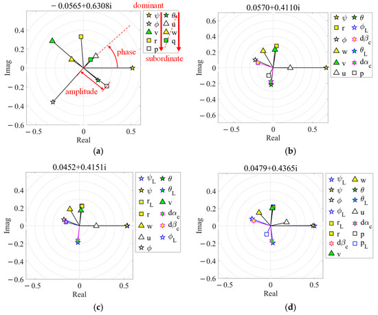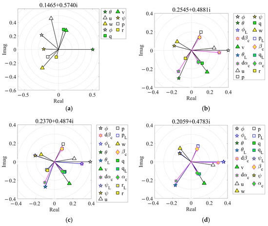 Dutch roll mode eigenvectors of four cases in hover. (a) No load. (b) 1-point. (c) 2-point. (d) 4-point.