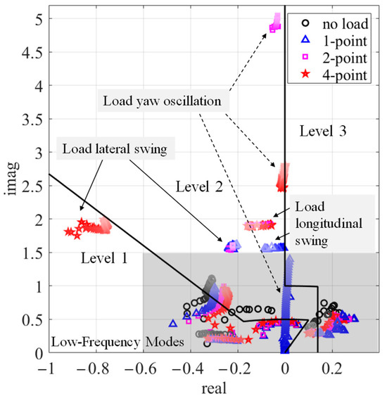 For load swing modes, the swing frequency of the load remains relatively unchanged as speed increases. However, multiple-point configurations exhibit a higher swing frequency compared to the 1-point configuration. The damping of the load’s longitudinal swing mode increases with speed, while the damping of the lateral swing mode decreases slightly. For the 4-point configuration, the stability of the load lateral swing mode is significantly enhanced to reach the Level 1 region. The stability of the load longitudinal swing mode shows slight improvement for the 2-point and 4-point configurations, but it remains within the Level 2 region. The above observations can be elucidated by examining the eigenvectors of the load lateral and longitudinal swing modes, as depicted in Figure 13 and Figure 14.