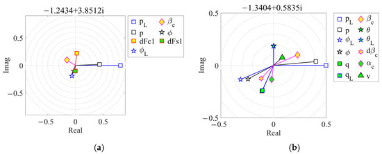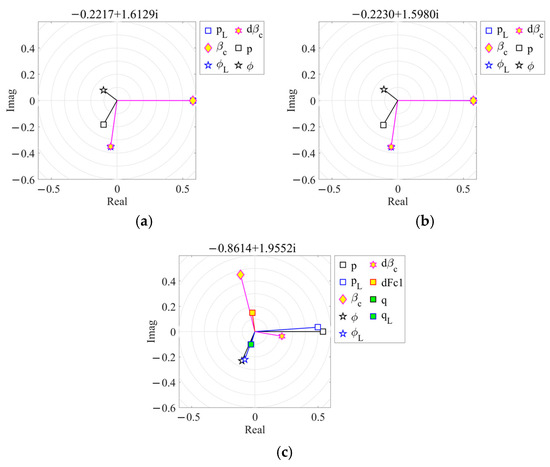 As illustrated in Figure 13, the eigenvectors for the 1-point and 2-point configurations are nearly identical, whereas significant changes are observed in the 4-point configuration. The eigenvector of the 4-point configuration reveals that the helicopter’s roll motions ( and ) have the same phase with the slung load’s roll motions ( and ). Additionally, the first-order cosine term of the rotor flapping rate (dFc1) appears in the 4-point configuration and has the same phase as the load’s lateral swing angle ().