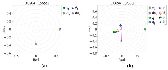In contrast, Figure 14 shows the eigenvectors of the load longitudinal swing mode. Although the helicopter’s pitch motions ( and ) and the load’s pitch motions ( and ) have the same phase, the amplitudes of and are much smaller due to the helicopter’s significantly larger pitching inertia compared to its roll inertia. The frequency of the load’s longitudinal swing mode increases due to the coupled interaction between the helicopter’s pitch motion and the load’s longitudinal swing motion. However, the smaller amplitude of the helicopter’s pitch motion results in less effective damping from rotor flapping dynamics compared to roll motion. Consequently, rotor flapping motion does not appear in the eigenvector of the load longitudinal swing mode, which is different from lateral swing. Therefore, the stability of the load longitudinal swing is slightly improved when a multiple hook point sling configuration is adopted.