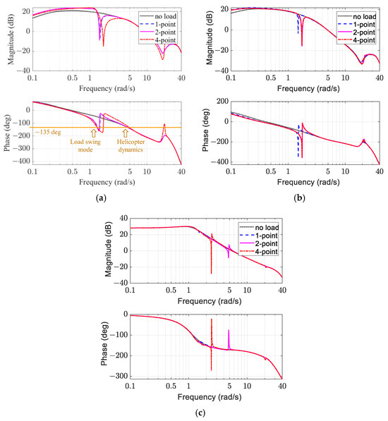 It can be observed from Figure 16a,b that roll and pitch responses exhibit significant magnitude notches and phase lags within the frequency range of 1–2 rad/s, which are associated with load swing modes. The roll responses for the 1-point and 2-point configurations are similar, whereas the 4-point configuration exhibits a higher frequency but larger magnitude notch. This difference is due to the higher frequency of the load lateral swing mode in the 4-point configuration. Conversely, the pitch responses for the 2-point and 4-point configurations are similar, whereas the 1-point configuration demonstrates a lower frequency, attributable to the smaller frequency of the load longitudinal swing mode in the 1-point configuration. The magnitude notch and phase lags in the roll response affect a wider frequency range than those in the pitch response. However, phase lags in the pitch response are more severe than in the roll response, exceeding −360 degrees. Additionally, multiple-point configurations affect a broader frequency range and introduce a deeper magnitude notch than single-point configurations due to the stronger coupling between the helicopter and the slung load.