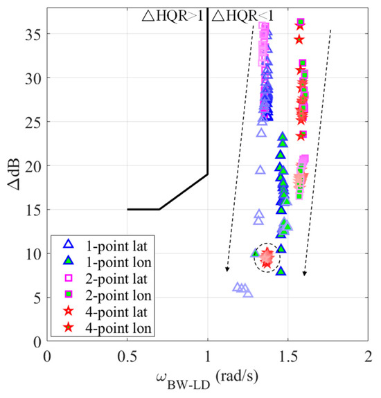 In the proposed revisions of the updated HQ specification ADS-33F [8], a new criterion, denoted as , is introduced to assess the degradation of handling quality ratings when carrying a slung load compared to the unloaded case. This metric is based on the load bandwidth () and delta dB () of the helicopter’s roll and pitch frequency responses. is defined as the lesser of the −135 degree crossing or the frequency of minimum phase due to the load mode. represents the deformation of the magnitude curve caused by the externally slung load, which is estimated from the centroid of the magnitude notch area in the critical frequency range of . The and of each trimmed state of the HSLS are plotted along with the boundaries specified in Ref. [8] to evaluate the HQ degradation when carrying a slung load.