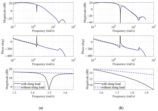 It should be noted that the 4-point sling configuration introduced a deeper magnitude notch in Figure 16a, while Figure 18 indicates a smaller . This is because, since is the lesser of the −135 deg crossing or frequency of the minimum phase due to the load swing mode, the magnitude notch frequency is distant from the frequency range of . For example, Figure 19 shows the pitch response of 1-point configuration and 2-point configuration with a large hook distance (4.8 m). The third figure is a closed view of the magnitude curve within the frequency range of . As shown in Figure 19b, it can be observed that the magnitude notch is distant from for the 2-point configuration with a large hook distance. As a result, the centroid and are smaller, indicating a mitigation of HQ degradation.