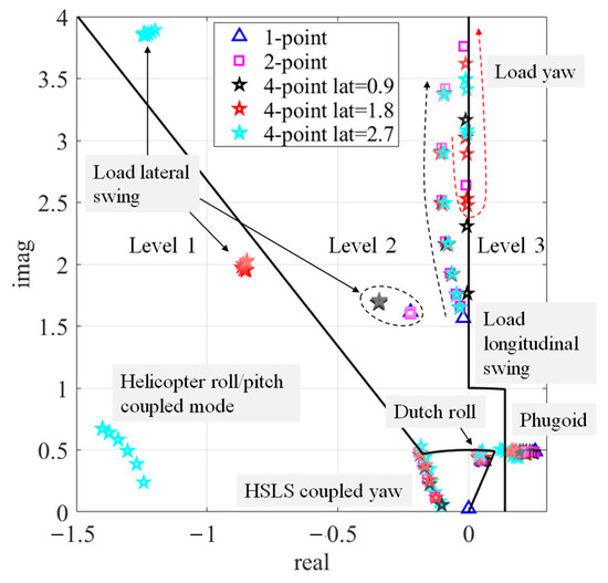 Figure 20 shows the low-frequency oscillation mode eigenvalues for various hook distances in hover. As the longitudinal hook distance increases from 1.2 to 4.8 m, the color of the markers fades. Three lateral hook distances of 0.9, 1.8, and 2.7 m are also used. The 1-point configuration is selected as the baseline.