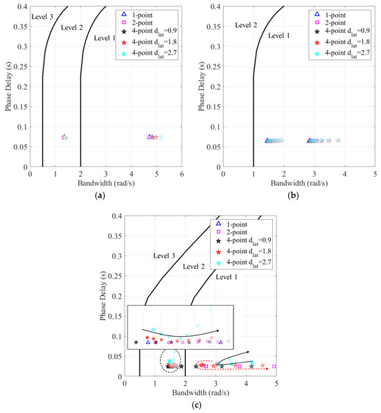Handling quality requirements concerning attitude and heading changes are based on the helicopter’s on-axis frequency response. Based on the linearized HSLS model, the helicopter’s on-axis frequency response can be obtained by drawing the bode plot of the transfer function from control input to attitude and heading changes. According to the definitions in ADS-33E, bandwidth, , and phase delay, , at every trimmed state can be obtained, as shown in Figure 15. At last, the obtained bandwidths and phase delays are plotted along with the attitude and heading change boundaries specified in ADS-33E.