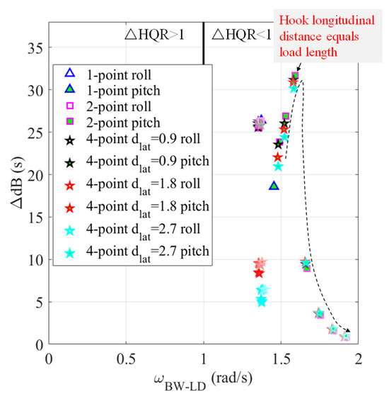 Figure 24 shows for various hook distances in hover. A larger lateral hook distance can decrease of the roll channel. However, of the pitch channel increases then decreases as the longitudinal hook distance increases, indicating the worst case is when the longitudinal distance equals the load length. This is because, as the hook distance increases, the magnitude notch becomes deeper and the notch frequency higher due to the stronger coupling between the helicopter motions and slung load motions. The magnitude notch deepens as the hook distance approaches the load length, while the notch frequency remains within the critical frequency range of , leading to maximum . As the hook distance increases further, the notch frequency continues to rise, moving further away from the critical frequency range, which results in a decrease in . In practice, since the ability to mitigate HQ degradation by reducing the hook’s longitudinal distance is limited, a hook distance equal to twice the length of the slung load is recommended.