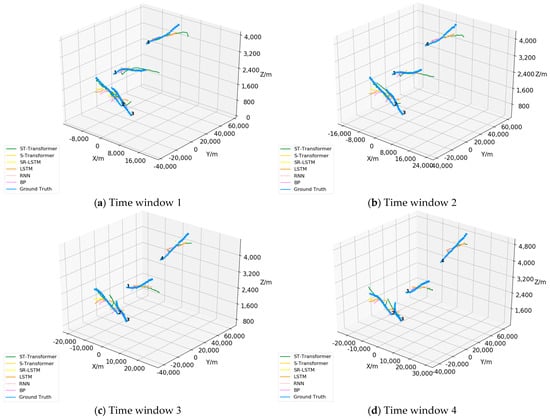To verify whether the ST-Transformer model considers the mutual influence among multiple aircraft during prediction, we examined the positional changes of interacting aircraft over time from a microscopic perspective. We selected the historical and future predicted trajectories of neighboring aircraft within different time windows for three-dimensional visualization, as shown in Figure 11. The origin coordinates represent the airport runway midpoint, as shown below. Although there are some deviations between the predicted and actual trajectories, the ST-Transformer model effectively captures and simulates the operational trends of aircraft compared to other models, resulting in more accurate trajectory predictions. Notably, Aircraft 2 and Aircraft 3 are in closer proximity. Controllers may pay extra attention to these aircraft to avoid potential conflicts, causing both to adjust their trajectories in response to each other. We can clearly see that in time windows 5 and 6, the model accurately predicts the right turn trend of Aircraft 3. Compared to other models that do not consider close-range spatial interactions between aircraft, ST-Transformer can achieve more accurate terminal trajectory predictions.