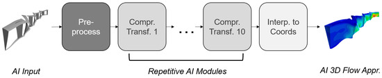 The AI model is a deep neural network. It uses standardized input and output quantities. This means that all variables have an expected value of zero and a variance of one. Thus, it can be assumed that all input variables have a similar influence on the output of the AI model. This would not be expected for input variables with very different ranges of values. Standardization of the outputs (zero mean, variance one), on the other hand, means that they have a comparable influence on the loss function. Otherwise, outputs with a wide range of values, such as pressure, could dominate the loss function. The loss function is the mean squared error (MSE) of all the output points. Each output point contains the five quantities x, y, and z velocity, density, and pressure. The AI basic structure consists of different modules: a pre-processing module, repeating data processing modules and an interpolation module (