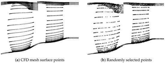 Figure 3 is from a data set described by 64 design parameters. Each parameter change will alter the coordinates of a large number of the 4096 randomly selected points in a row. Depending on the application and the choice of design variables, a different number of randomly selected points may be appropriate. However, a certain degree of universality can be expected. The advantage of using CFD meshes is that they have a very fine resolution in sensitive regions with high flow gradients. On the other hand, uncritical areas can be represented with fewer cells. Therefore, a random selection of points ensures that the distribution of points remains comparable: Areas that are represented by a high resolution in the CFD mesh remain more finely resolved.