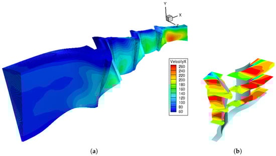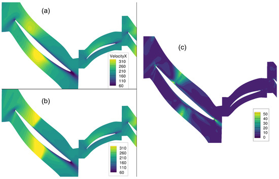 Figure 13 shows a comparison of the flow velocities in the axial direction for the aerodynamic design point at 100% rotational speed.