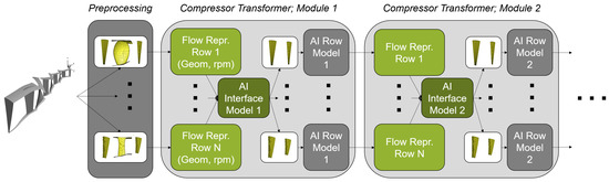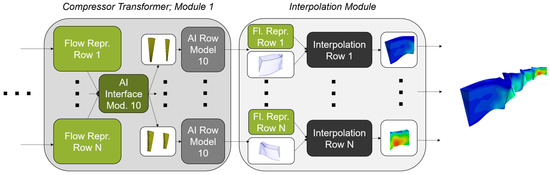 Initially, the AI interface model contains CFD cell coordinates of all interfaces. This location information is used to derive the effects of the compressor inlet and outlet boundary conditions on the interface positions. Each blade row is initially represented by its geometry and rotational velocity. This information is used to initialize the boundary conditions of all interfaces, labeled as “Flow Repr.” in Module 1 of