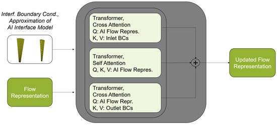 20]. The attention mechanism of the transformer is used in two different ways. Cross-attention is used to add information from other tensors. Self-attention is used to exchange information within a tensor. In the AI interpolation model, only cross-attentions are used to extract the required information from the AI flow representation and to generate the flow approximations for each cell independently. In the cross-attention mechanism, no information is exchanged between the cells, which are the input of the query tensor. For this reason, it is possible to subdivide the cell-centered points of the CFD mesh into any number of subsets. These subsets can be approximated individually. This avoids memory problems even with large CFD meshes.