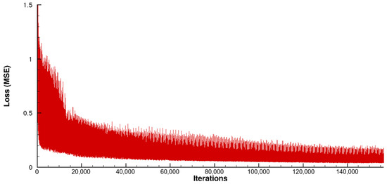 The plot shows the variation in the MSE of the samples due to the different geometries and operating points. Only one sample is used in each training iteration. This is due to the memory requirements of both the samples and the AI model. In order to be able to use arbitrary mini-batch sizes, a gradient accumulation method was implemented. The gradients from each training iteration are summed up and the result is stored. The actual gradient step to update the parameters of the AI model takes place after a given number of training iterations, in this case, every 16 iterations. As only one sample is used in each iteration, the mini-batch size is also 16.