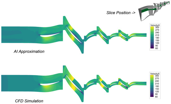 A design from the initial phase of the CFD optimization process was selected for this comparison and recalculated with the AI model. A meridional section through the three-dimensional flow solution is presented to facilitate a comparison between CFD and AI flow. Therefore, the axial velocity is depicted.