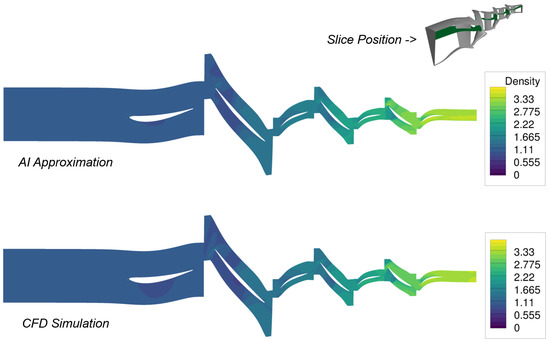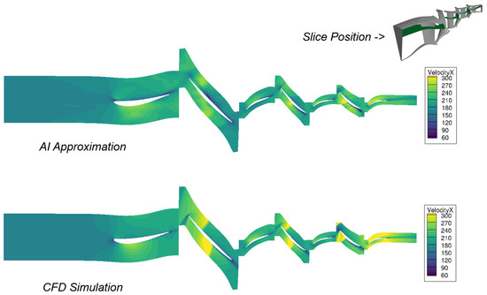 Run times for the CFD operating points were between 5 and 15 min (2 CPUs, Advanced Micro Devices, Inc. (AMD), Santa Clara, CA, USA, EPYC 7601, 32 cores, 2.2 GHz). The AI approximation of an operating point took 10 to 15 s (one GPU, NVIDIA, Santa Clara, CA, USA, RTX A6000, 48 GB). With finer CFD meshes, the speed advantage of the AI model would probably increase further. In addition, the AI approximations naturally do not show any convergence problems compared to CFD solvers.