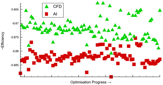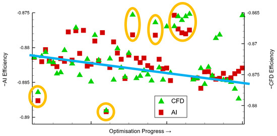 The general trend of increasing efficiency during that phase in the CFD optimization is also reflected in the AI recalculations, indicated by the blue straight line in