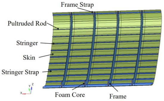 In the PRSEUS structure, the stacks, flanges, tear straps, and skin are made of composite laminate, while the pultruded rods at the top of the stringers are composed of T800 carbon fiber and 3900-2B resin. The foam core of the frames utilizes Rohacell foam. The material properties of the pultruded rods at the stringer tops and the frame’s foam core are detailed in Table 2, and those of the composite laminates are in Table 3 [28,29].