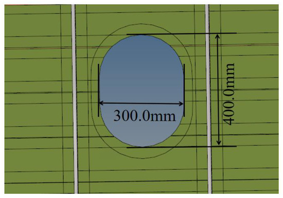 The placement of openings must consider the overall aircraft layout, usage, maintenance, and repair requirements. The small-opening design for the PRSEUS panel is based on the dimensions of aircraft passenger cabin windows. The dimension diagram for the small-opening PRSEUS panel is shown in the Figure 4, with edge lengths of 300.0 mm and 400.0 mm.