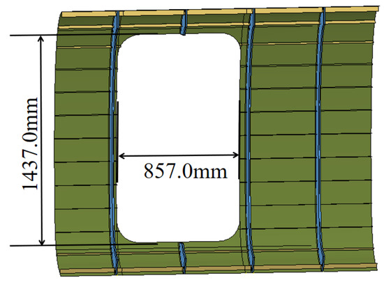 The panel model studied in this paper is derived from the side panel of the fuselage’s pressurized cabin. The established 3D model is depicted in Figure 2 and Figure 3. The main dimensions of the curved panel are provided in Table 1.