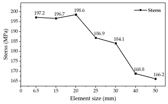 To perform the mesh convergence analysis for the panel structure without openings, the tensile load condition of 6500 N/mm2 is selected as a representative condition for the mesh convergence assessment, considering that the tensile and compressive load conditions are all in-plane loads applied with the same load magnitude. Figure 6 shows the maximum stress values at different mesh scales, and the simulation results show that the stress maps of the PRESUS wall model at each mesh scale show similarity and the maximum stress values are all located at the same position. According to the analysis results, when the mesh size is less than or equal to 20 mm, the calculation results show a convergence trend. Therefore, this paper adopts 20 mm as the grid size for meshing the model.