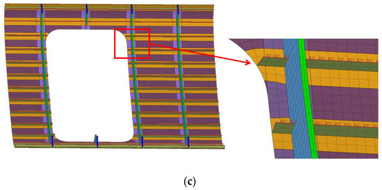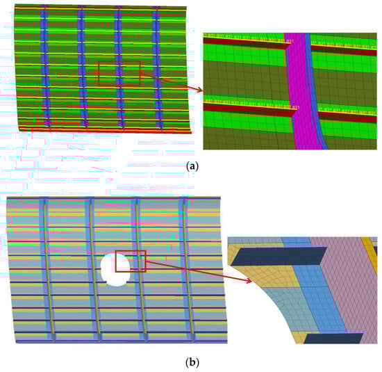 In the PRSEUS structure, the stacks, flanges, tear straps, and skin are made of composite laminate, while the pultruded rods at the top of the stringers are composed of T800 carbon fiber and 3900-2B resin. The foam core of the frames utilizes Rohacell foam. In this section, Hypermesh 2021 software is used to create the element mesh. C3D8R elements are utilized for the foam core of the frame, the BAR2 elements for the stringer pultruded rods, and the S4R and S3R elements for the other composite laminates. The global mesh size is set at 20.0 mm. Mesh quality is optimized according to the standards in Table 5, and the panel mesh model is shown in Figure 7.