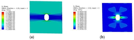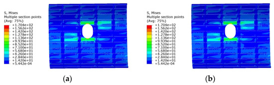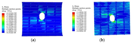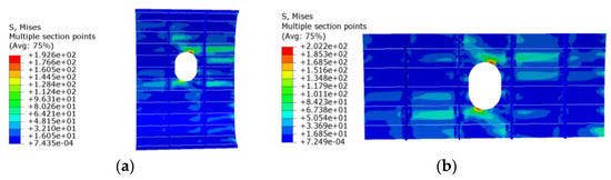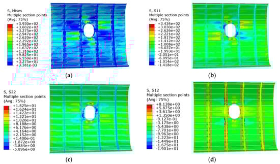The stress contour plots for each scheme are displayed in Figure 8, Figure 9, Figure 10 and Figure 11. With the size and shape of the panel opening remaining constant, the primary factor influencing stress concentration in a PRSEUS panel structure under a tensile load is the fiber ply angle of the composite material of the open panel. The secondary factor is the arrangement of load-bearing structures, such as panel frames and beams. Without altering the fiber ply angle or the structural layout of the frame and beams, the maximum von Mises stress in the panel typically occurs near the opening, with the relative position of the opening remaining unchanged.